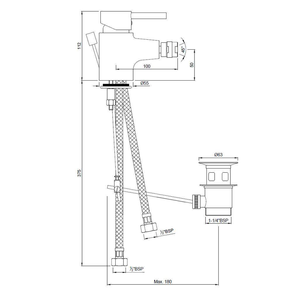 Single Lever 1-Hole Bidet Mixer with Popup Waste System with 300 mm Long Braided Hoses